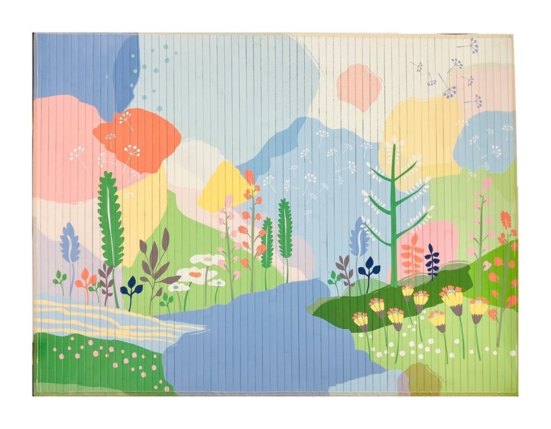 Crafted from durable bamboo slats, this 47″ x 35″ mat blends natural texture with bold graphic design. The calming blues and greens are beautifully balanced by warm pops of coral, yellow, and blush, creating a serene meadow scene that instantly brightens any room. The vertical bamboo lines subtly add dimension, giving the artwork a unique tactile quality.